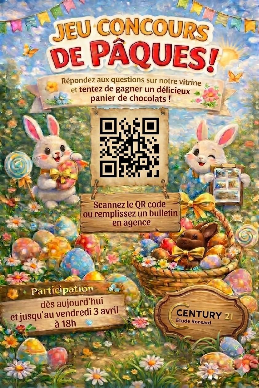 Rendez-vous devant notre agence CENTURY 21 Étude Ronsard à Massy, scannez le QR code en vitrine et participez au quiz en ligne pour tenter votre chance. 🍫